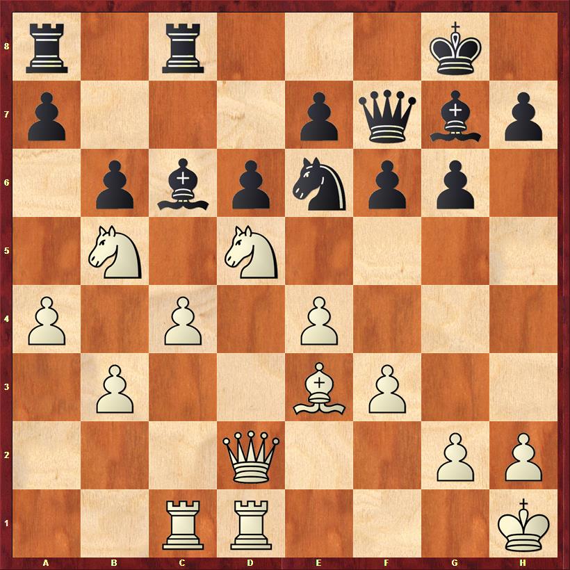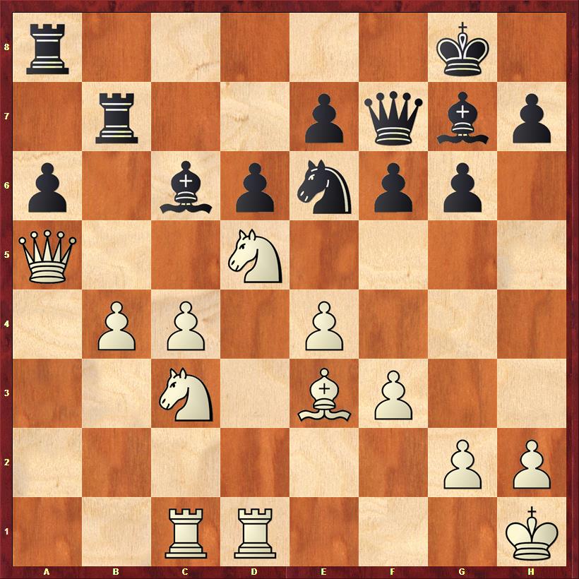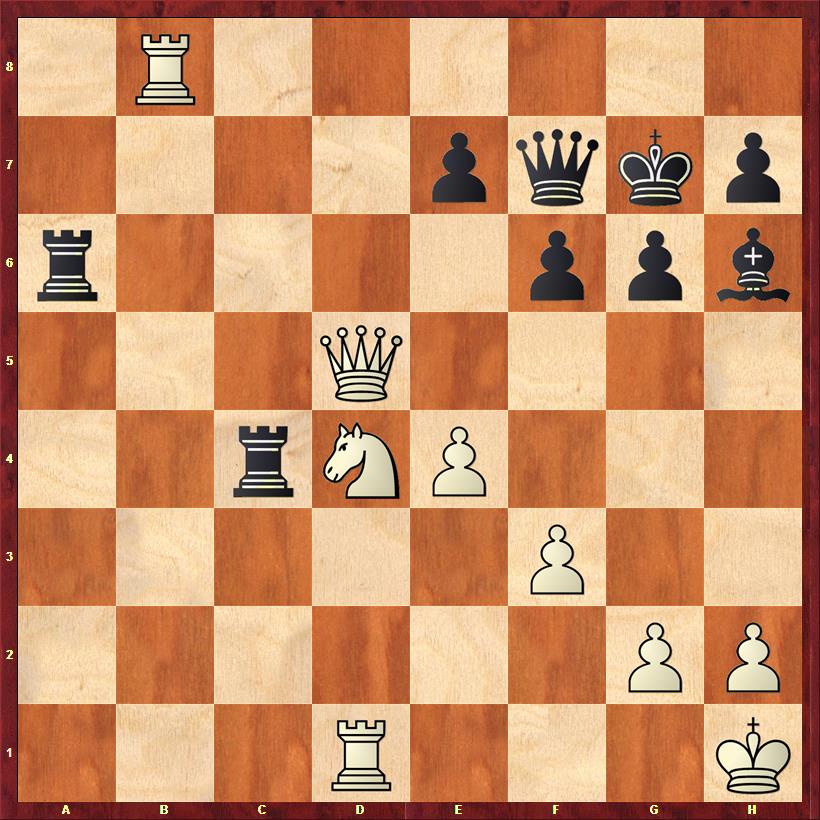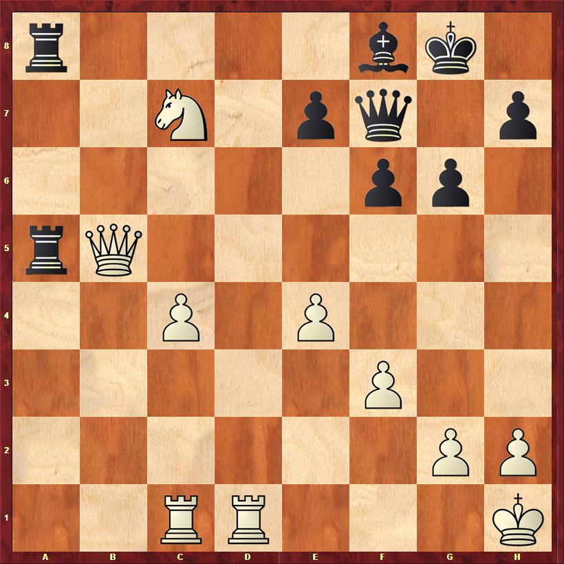 40. Qb6? (This was the last simple win in the game 40. Nxa8!? Rxb5 41. cxb5 white has two rooks for the Queen, and stopping the b pawn from promoting will cost at least the bishop) 40… R8a7 41. Nb5 R7a6 42. Qb7 Ra2 43. Qd5? (I decided that I wanted to get the Queens off the board, but the bishop combined with the rook is a really powerful combination 43. c5 is still winning according to Houdini.) 43… Bh6 44. Rb1 Rc2 45. Nd4? Rxc4 46. Rb8+ Kg7? (46…Bf8 is equal) and here I played 47. Qxf7+ and offered a draw, aware that I had messed the position up. What I wasn’t aware of what that black’s last move was a major blunder so here is a puzzle – white to play and win – answer at the end of the article.