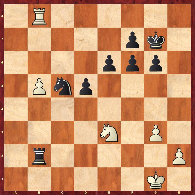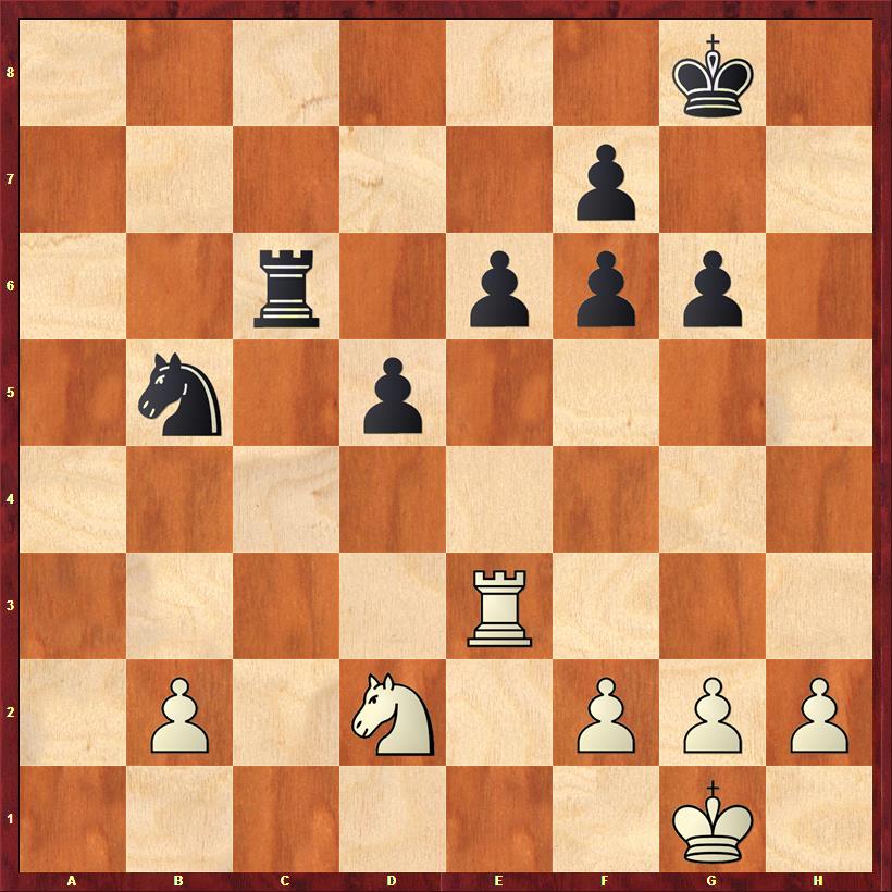 As well as being a pawn down, white’s pieces are very badly placed, and this enough to win a second pawn and consequently the game. 36. Rb3 Nd4 37. Rb8+ Kg7 38. g3 Rc2 39. Nf1 Nf3+ 40. Kg2 Ne1+ 41. Kg1 Nd3 42. b4 Rxf2 43. b5 Rb2 (43… d4 immediately is even stronger because the knight then can’t move.) 44. Ne3 Nc5